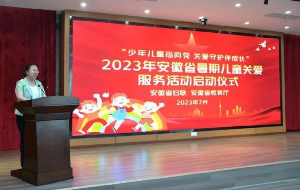 7月11日上午, 以“少年儿童心向党 关爱守护伴成长”为主题的2023年安徽省暑期儿童关爱服务活动启动仪式在安庆市宜秀区举行。省妇联党组书记、主席刘苹出席并宣布活动启动。仪式由省妇联党组成员、副主席蔡小莉主持,宜秀区委书记郑志致辞。省委教育工委、省妇联、省直妇工委相关部门负责人,市、区相关部门负责同志,全省各市妇联主席、副主席、家儿部长,大学生志愿者以及学生、家长代表100余人参加了活动。