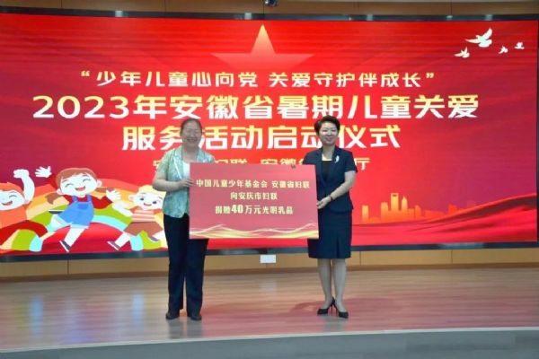 刘苹代表中国儿童少年基金会、 安徽省妇联向安庆市妇联捐赠40万元光明乳品,在场领导还为学生代表赠送了关爱大礼包。